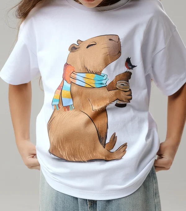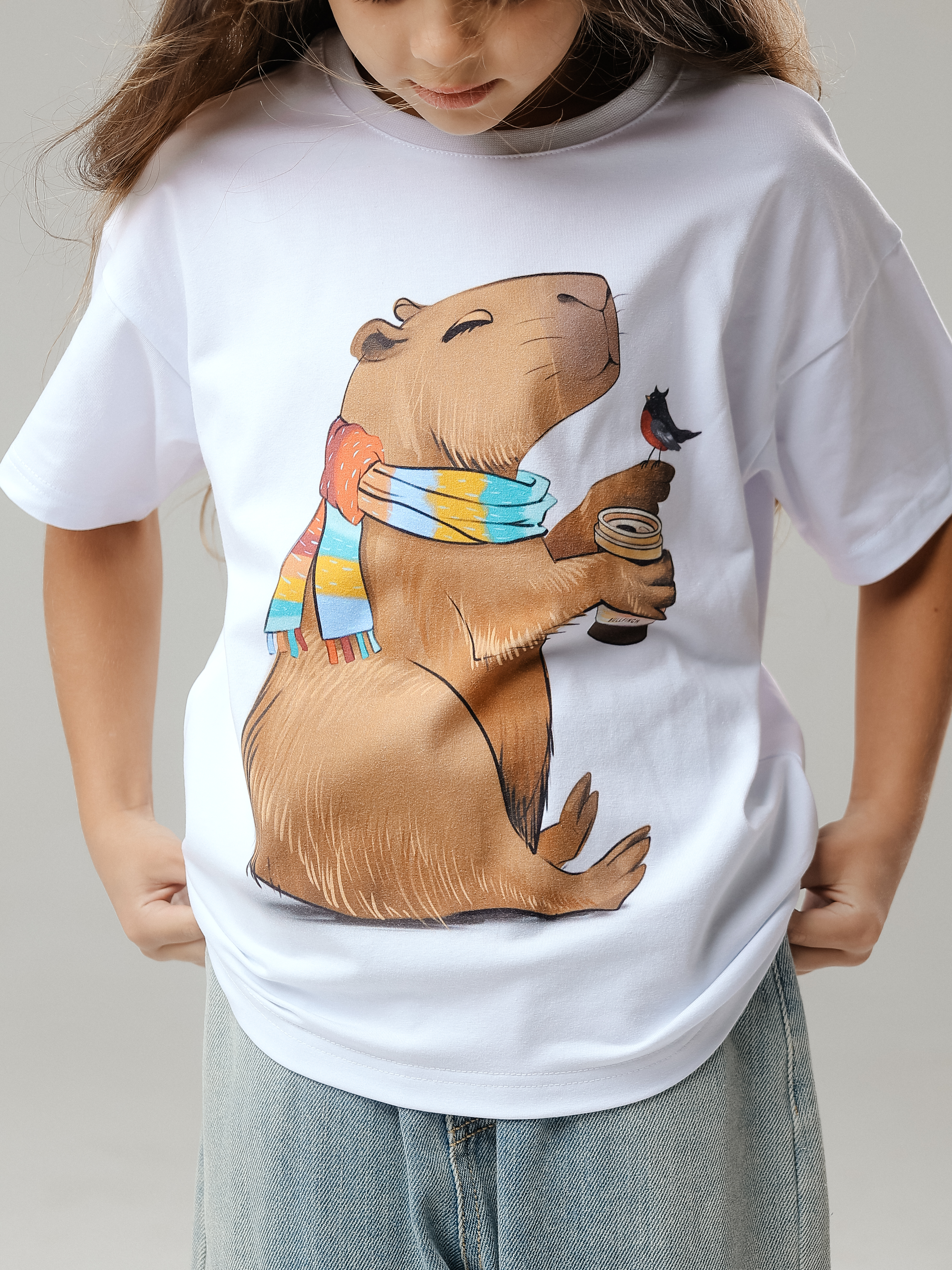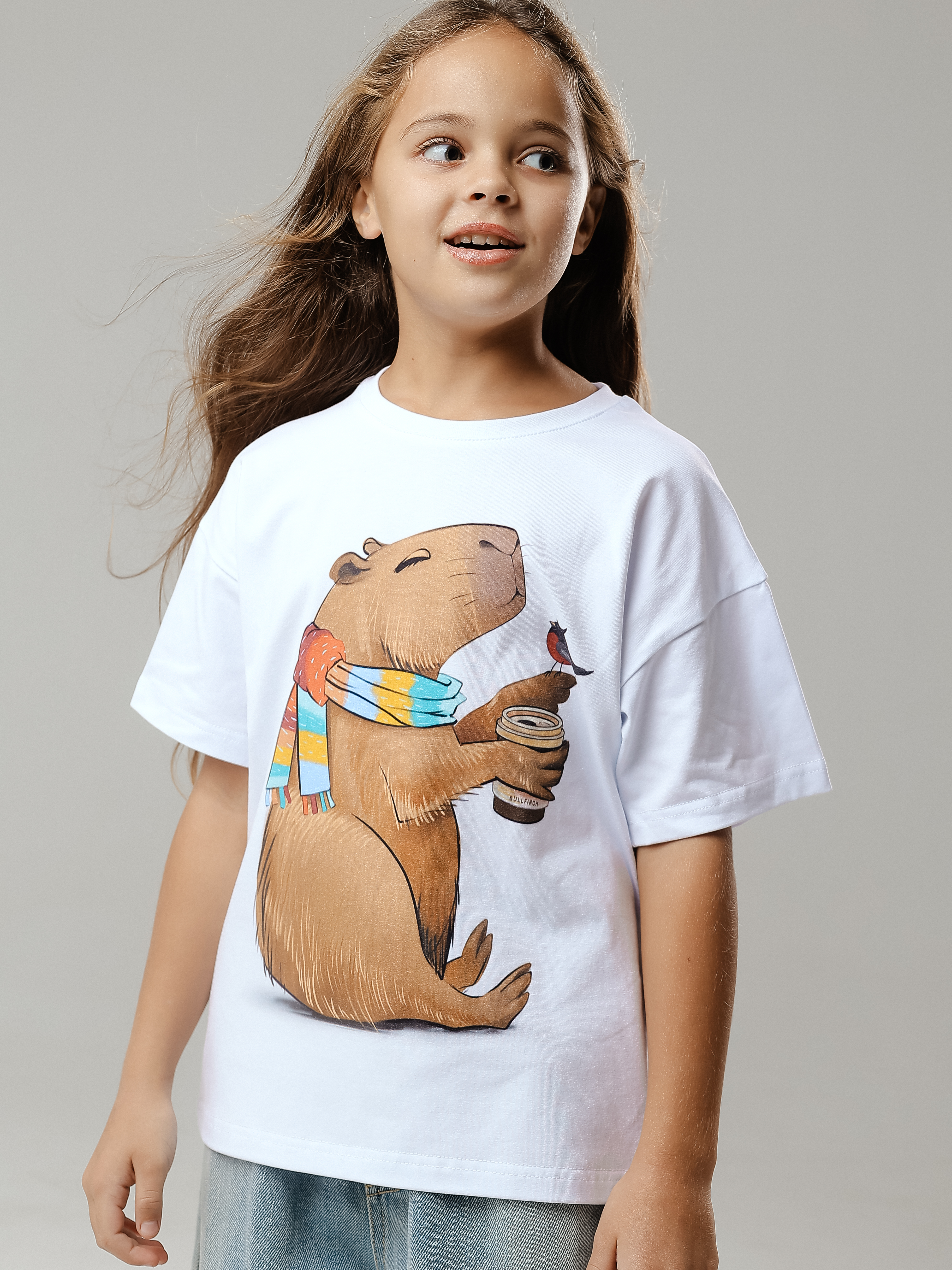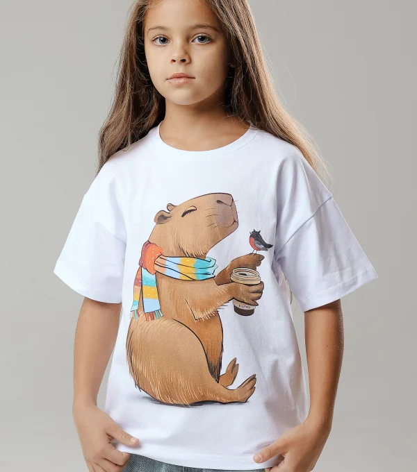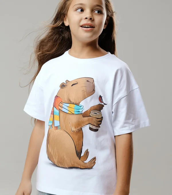 Купить детскую oversize футболку - Футболка Капибара со стаканчиком с доставкой по России в магазине Bullfinch. Размеры: Д5-6 , Д7-8 , Д9-10