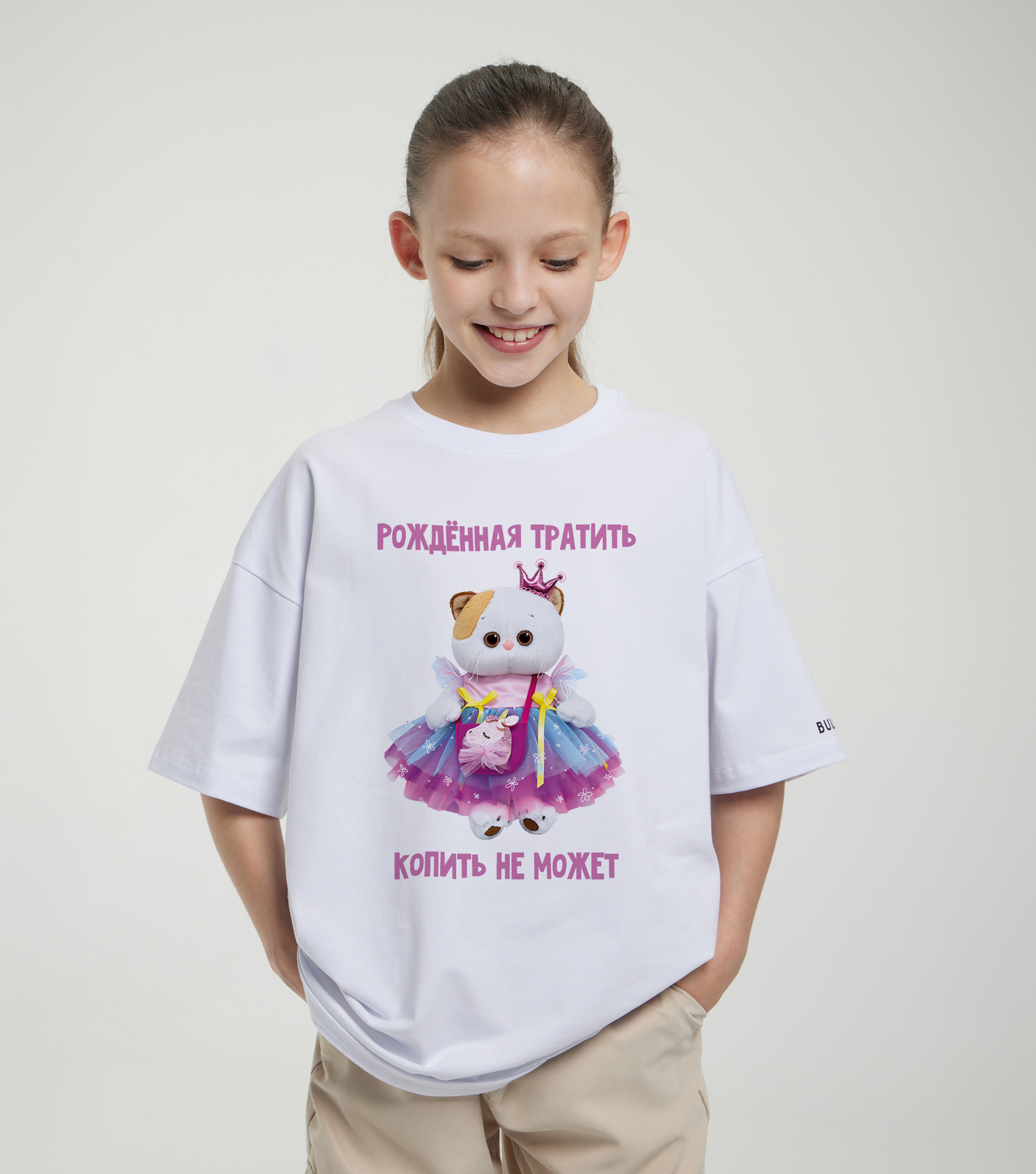 Купить детскую oversize футболку - Футболка Басик & Ко "Рожденная тратить копить не может " с доставкой по России в магазине Bullfinch. Размеры: Д5-6 , Д7-8 , Д9-10