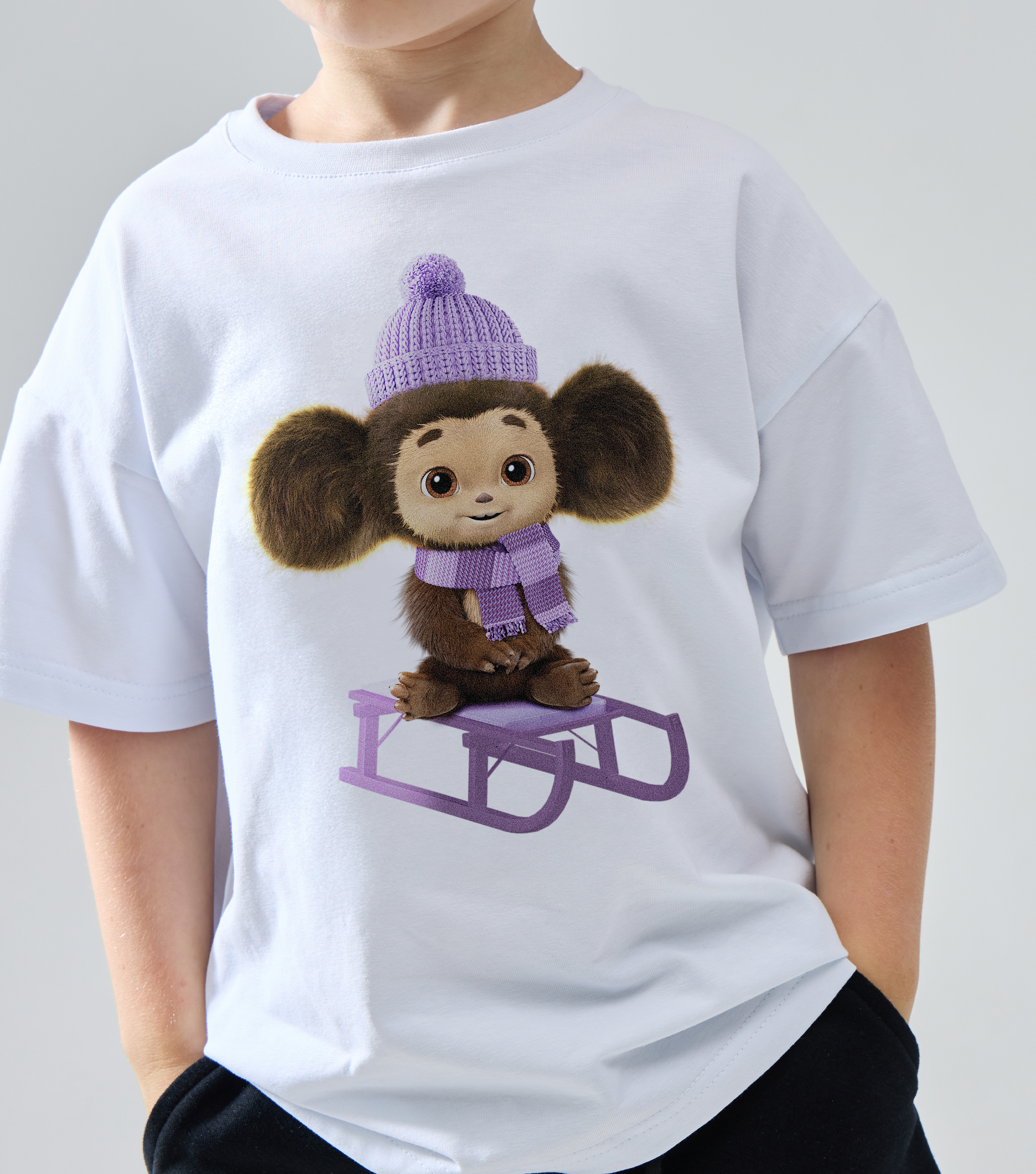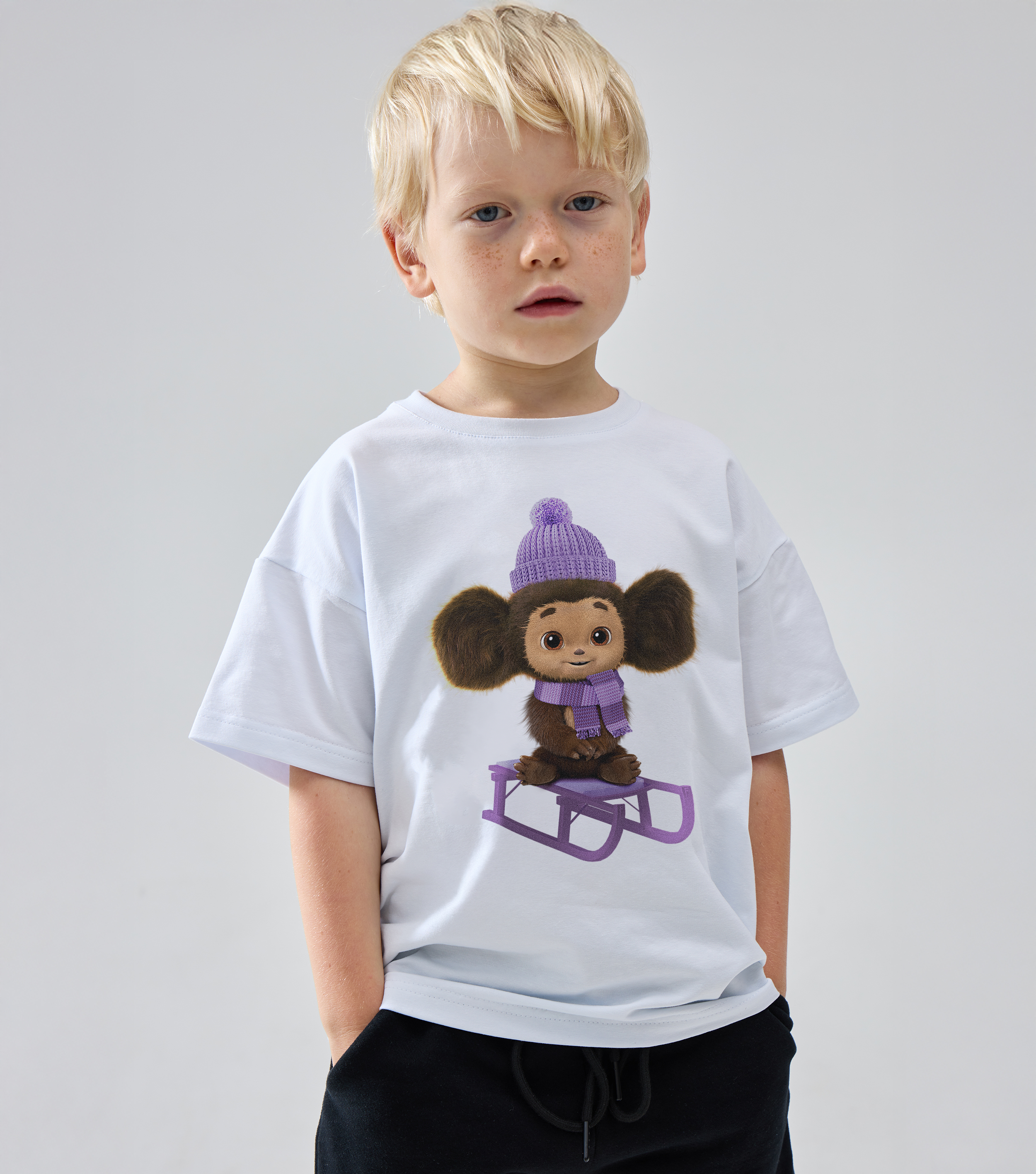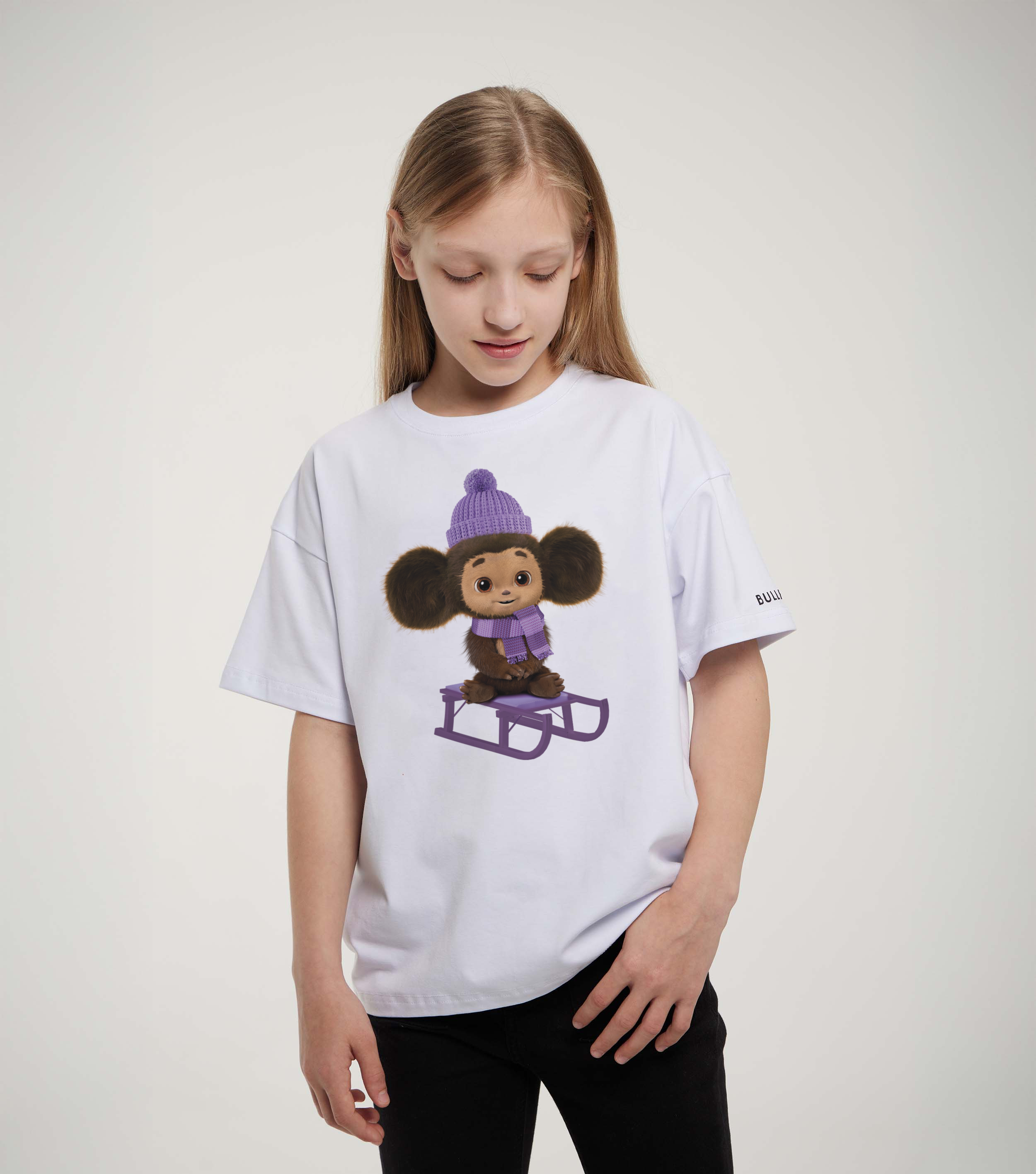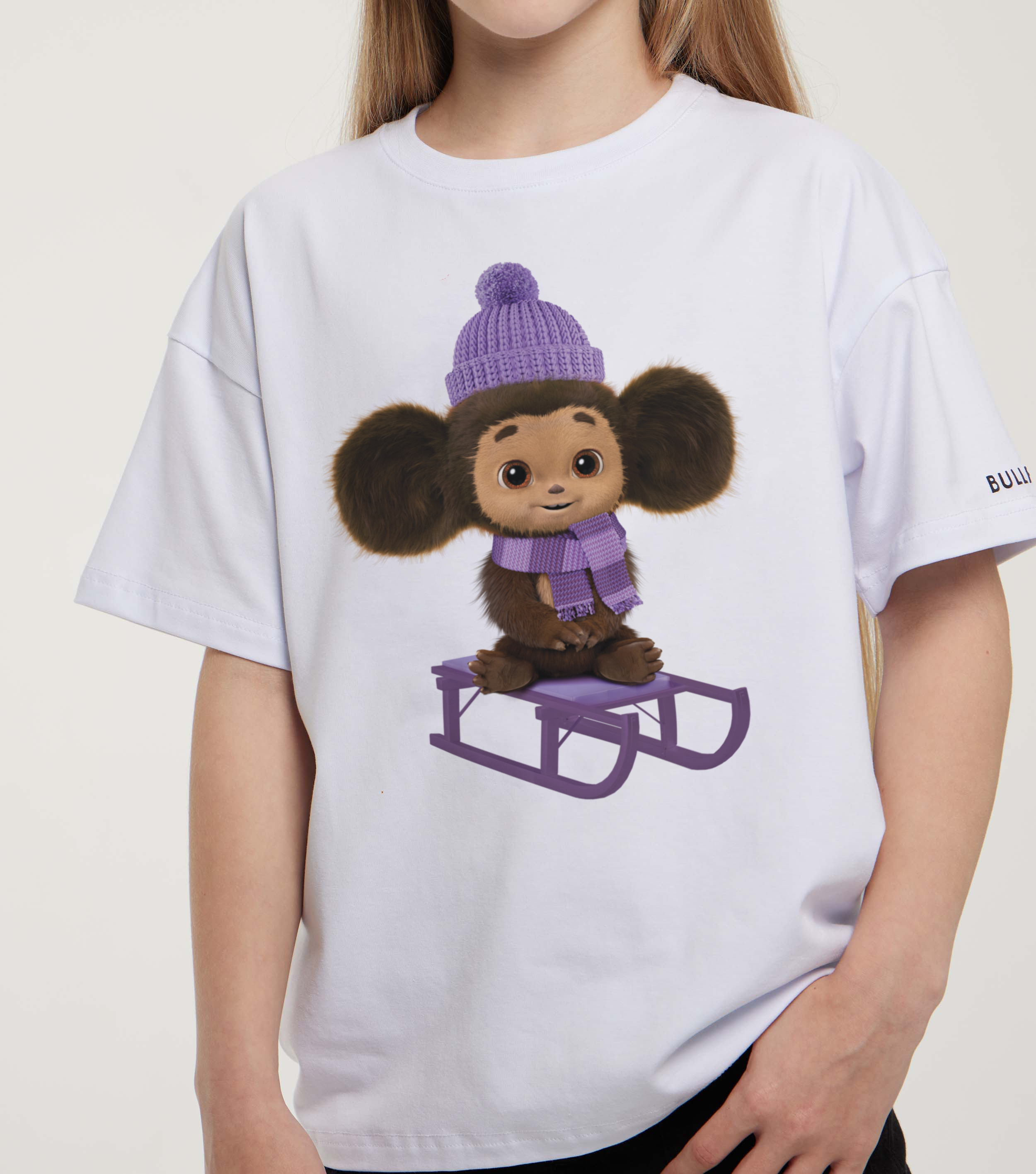 Купить детскую oversize футболку - Футболка Чебурашка на санках с доставкой по России в магазине Bullfinch. Размеры: Д5-6 , Д7-8 , Д9-10