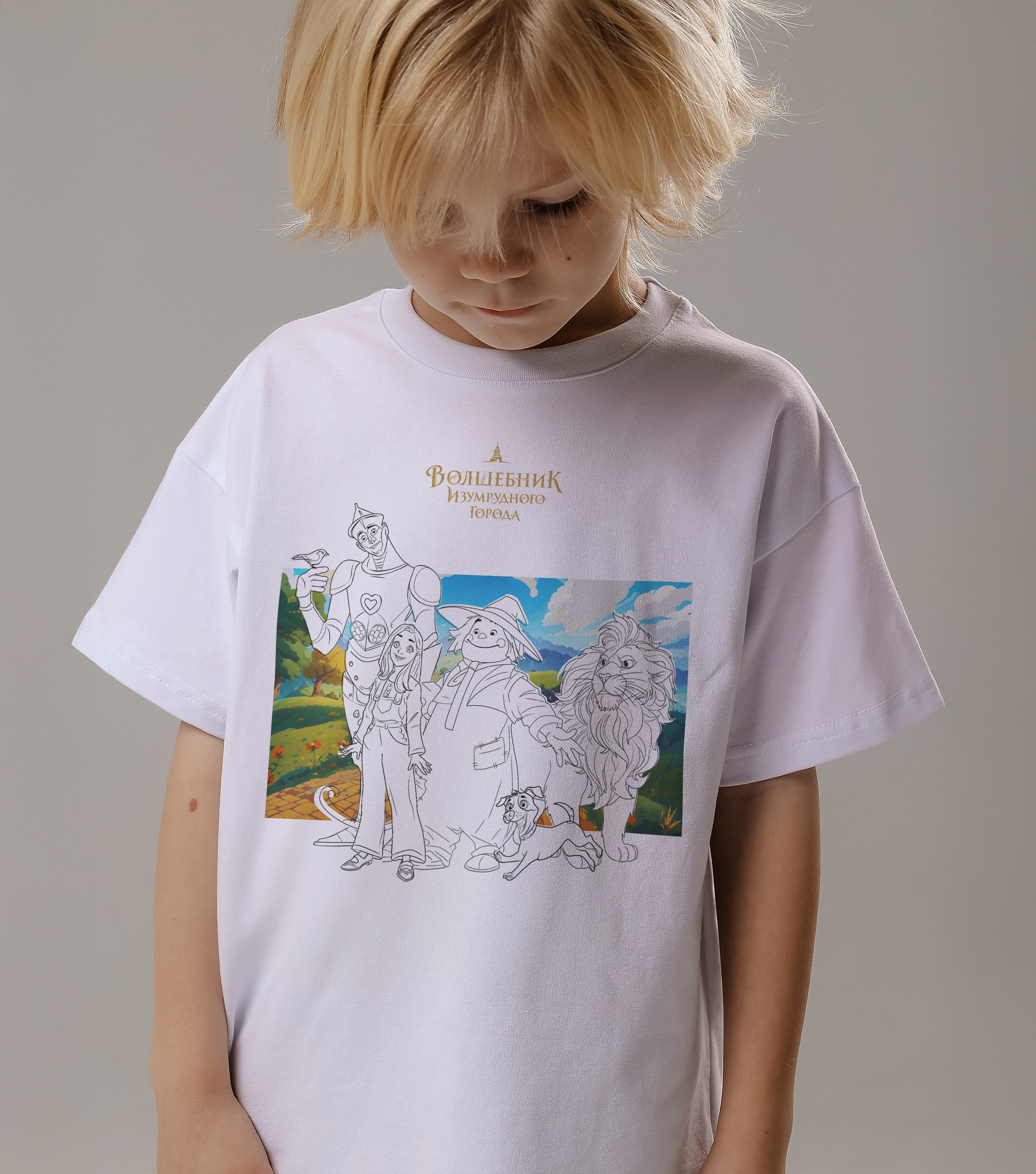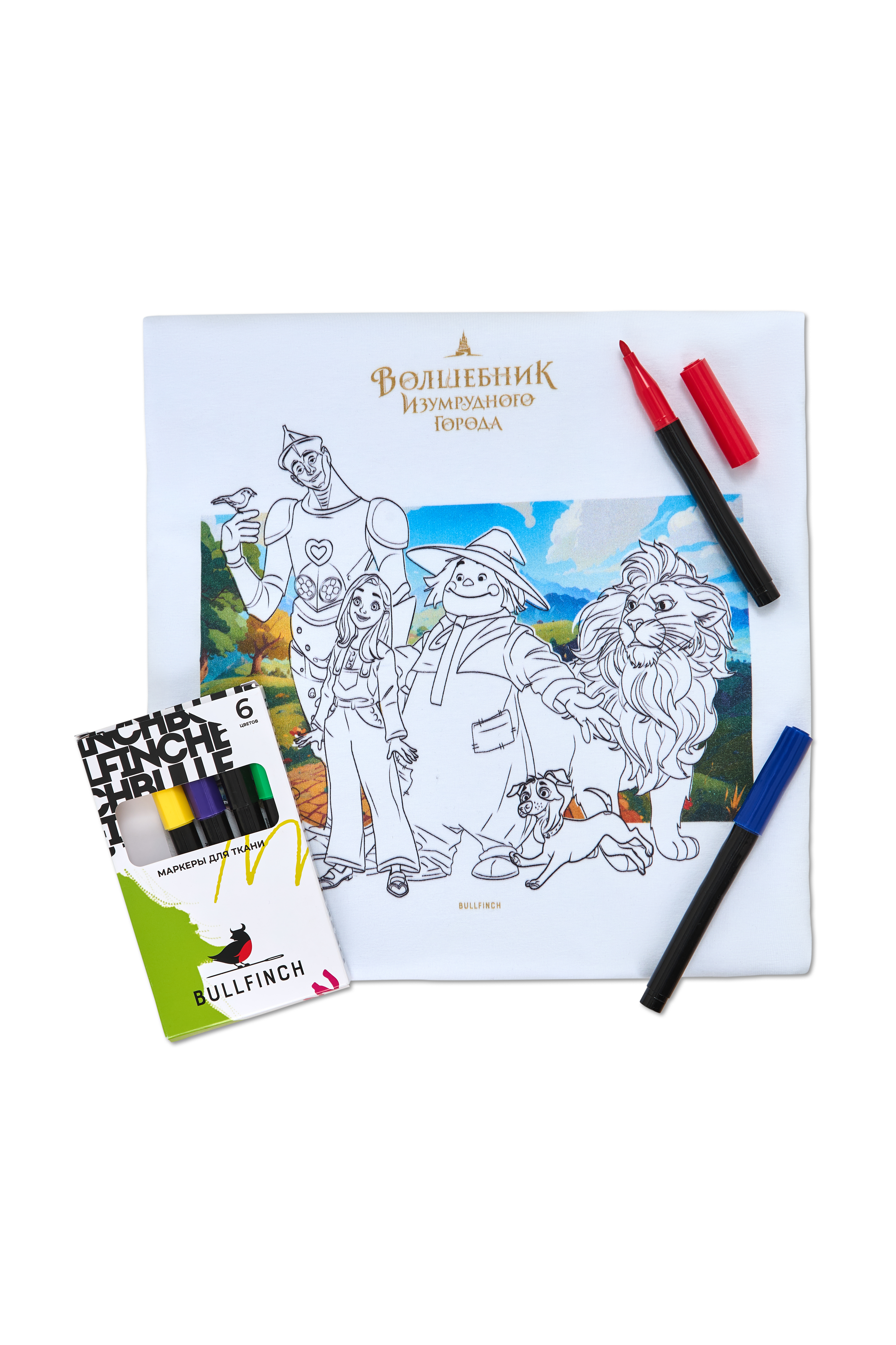 Футболка-раскраска Главные герои. Волшебник Изумрудного Города - Купить с доставкой по России в магазине Bullfinch. Футболки-раскраски, Детская одежда. Гипоаллергенные краски. Премиальное качество. Размеры: Д5-6, Д7-8, Д9-10