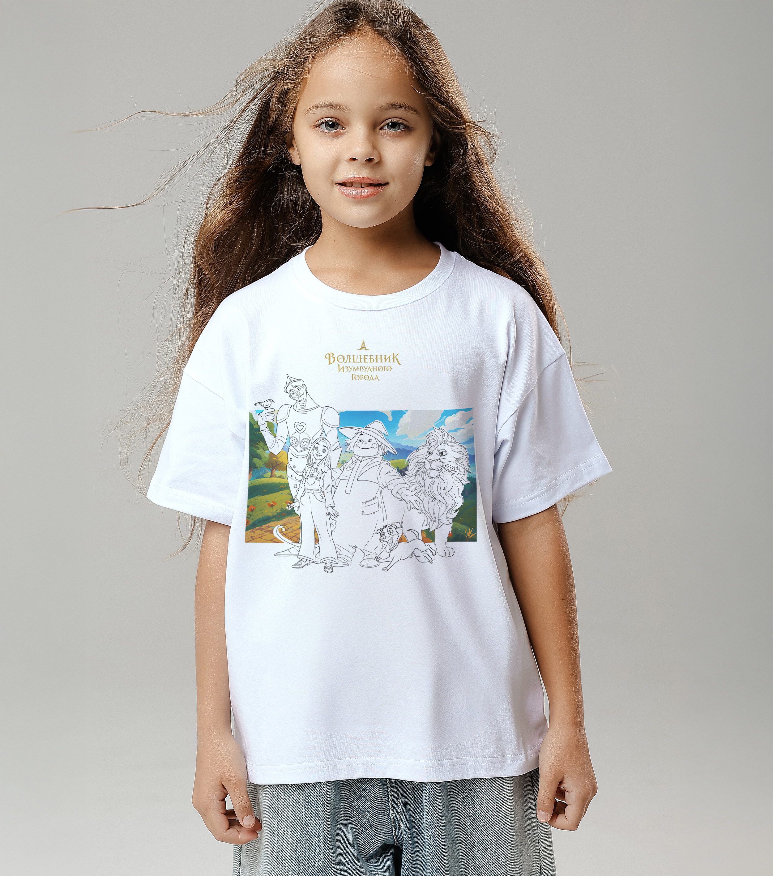 1. Высококачественная футболка в крое оверсайз с изображением из коллекции "Волшебник Изумрудного Города" и уже подготовленным фоном для раскрашивания.