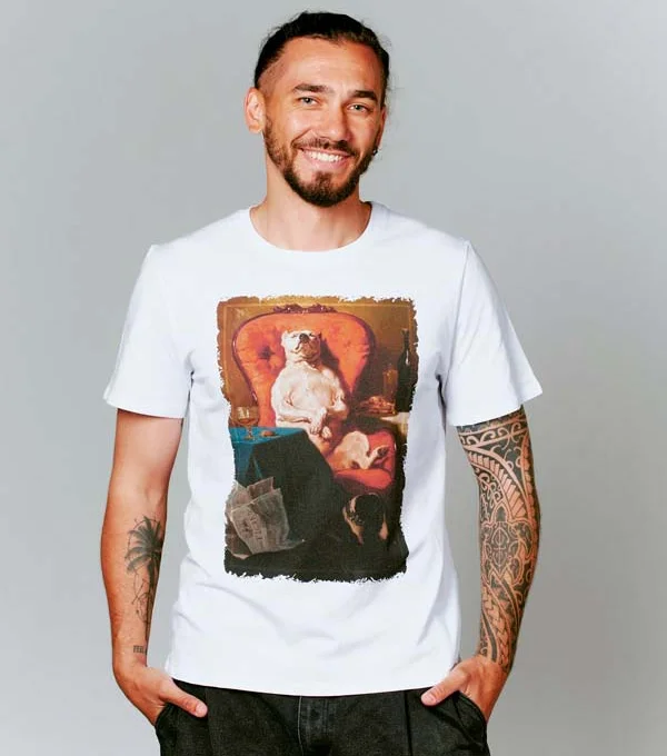 Футболка мопс в кресле Эрмитаж - Купить с доставкой по России в магазине Bullfinch. Прямые футболки, Мужская одежда. Гипоаллергенные краски. Премиальное качество. Размеры: M, XS, S, M, L, XXL, XXXL, XXXXL