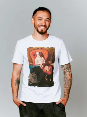 Футболка Мопс в кресле. Эрмитаж - Купить с доставкой по России в магазине Bullfinch. Прямые футболки, Мужская одежда. Гипоаллергенные краски. Премиальное качество. Размеры: M