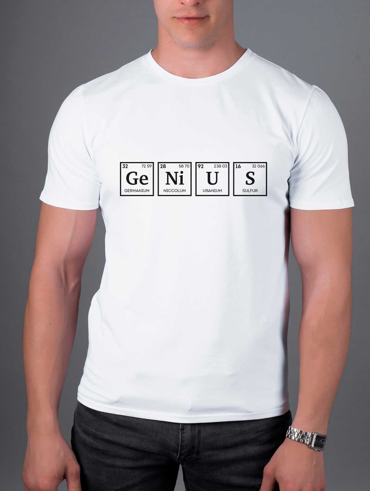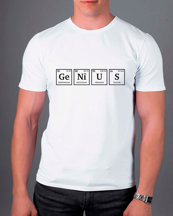4 химических элемента таблицы Менделеева составили слово GENIUS. Интересный подход к воплощению слова "Гений" в принте оценят люди с нестандартным мышлением. Довольно лаконичный принт с необычным посылом, который так же представлен на женском крое.