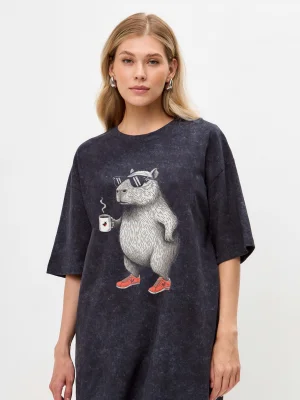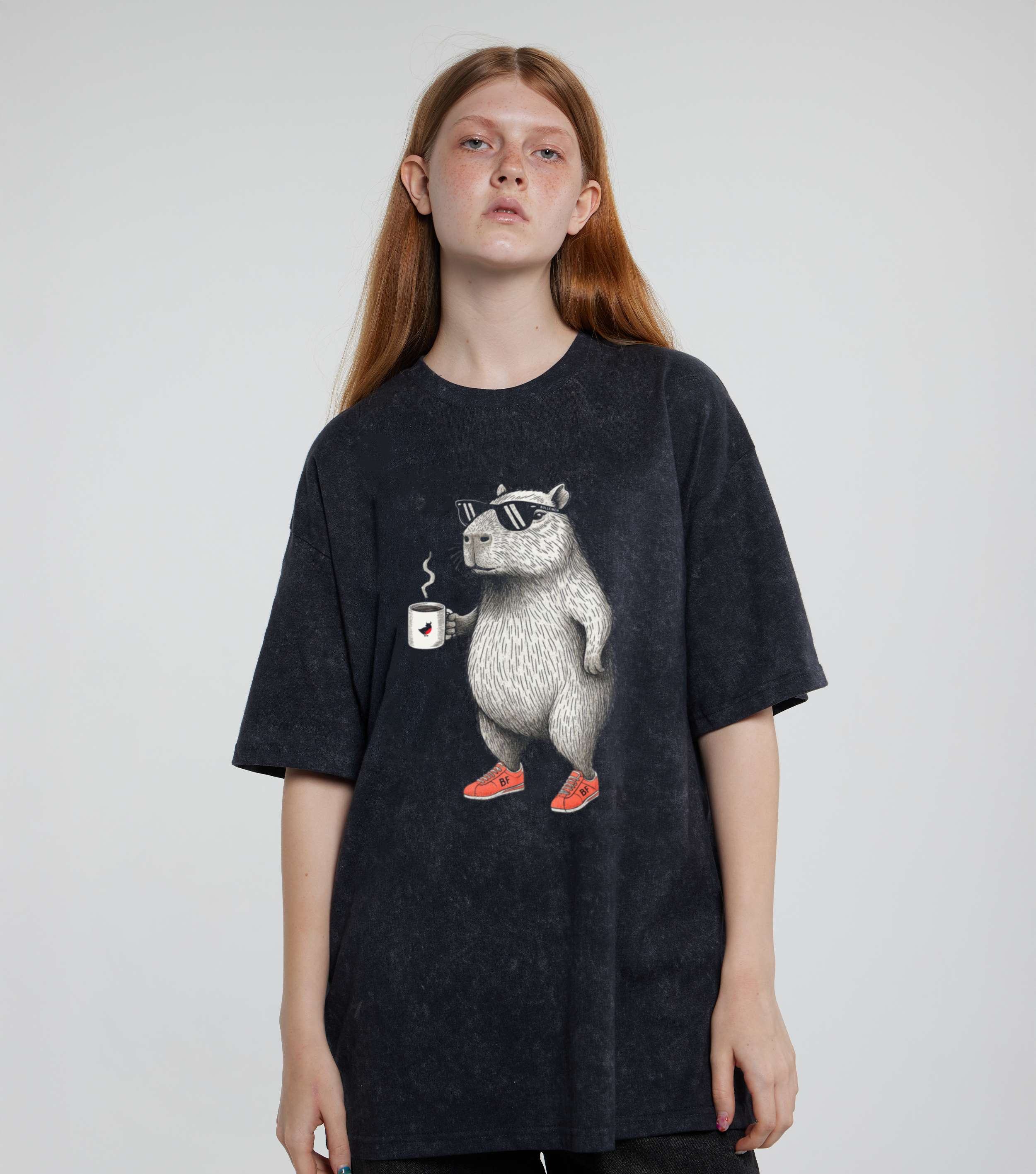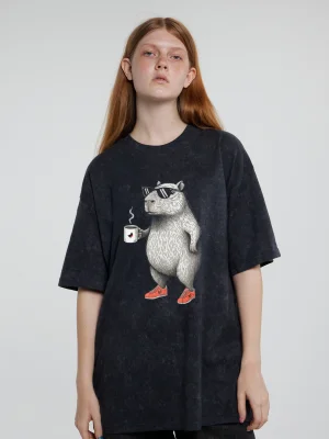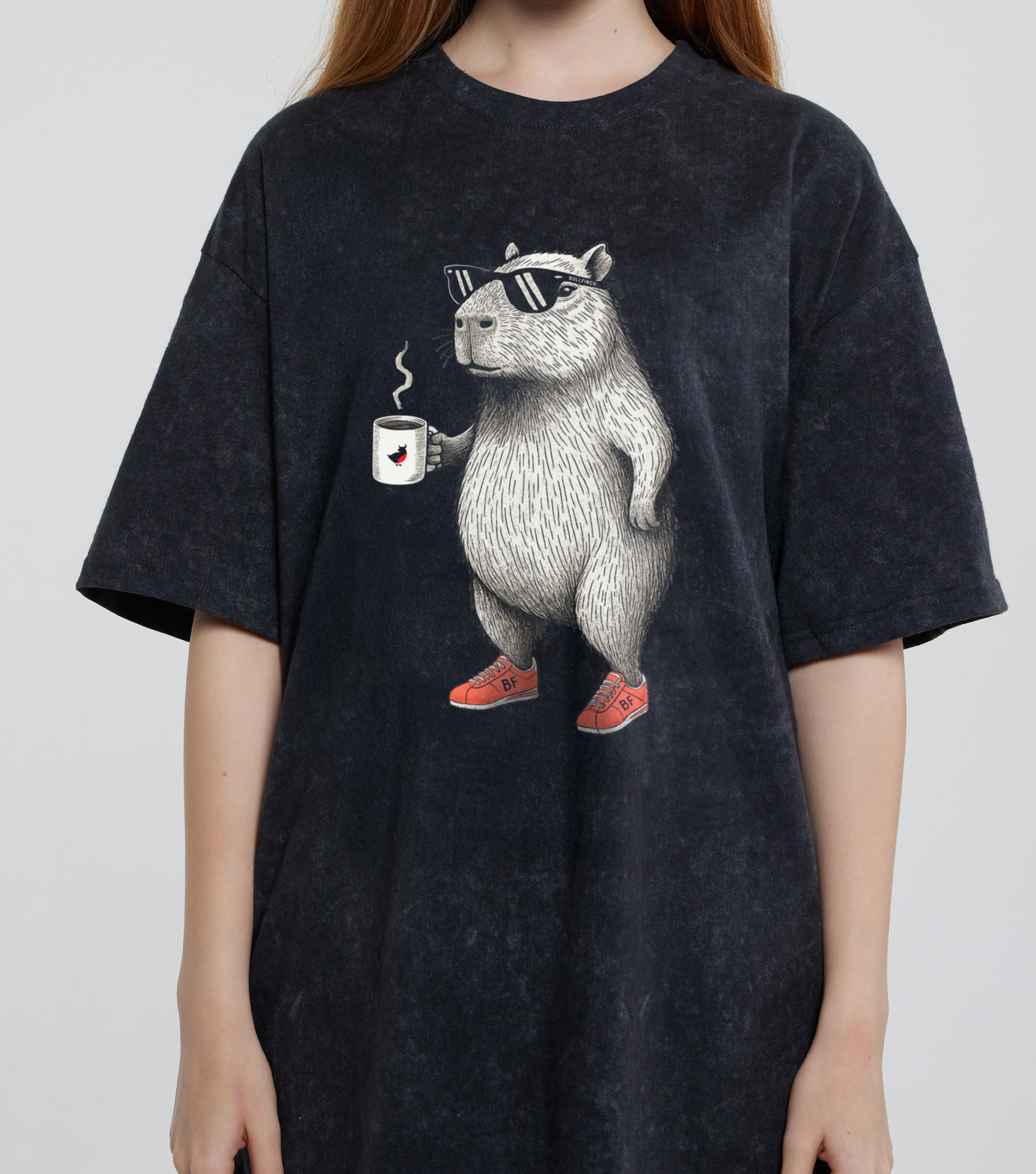 Футболка Капибара в кедах - Купить с доставкой по России в магазине Bullfinch. С вареным эффектом, Женская одежда. Гипоаллергенные краски. Премиальное качество. Размеры: XS, S, M, L, XL