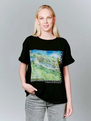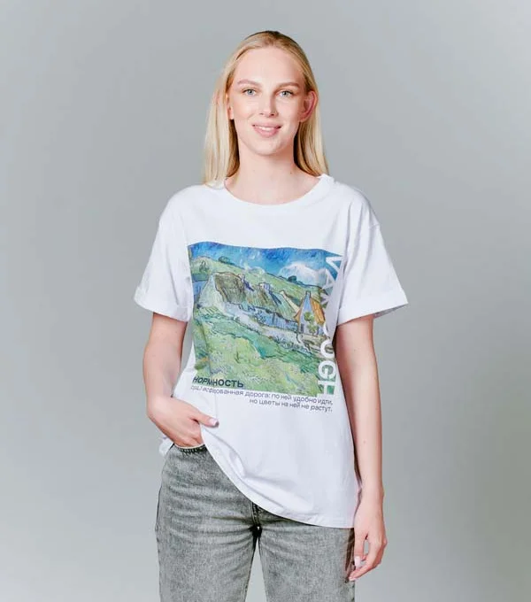Футболка Ван-Гог Эрмитаж - Купить с доставкой по России в магазине Bullfinch. Оверсайз рукав с отворотом, Женская одежда. Гипоаллергенные краски. Премиальное качество. Размеры: M, L, S, M
