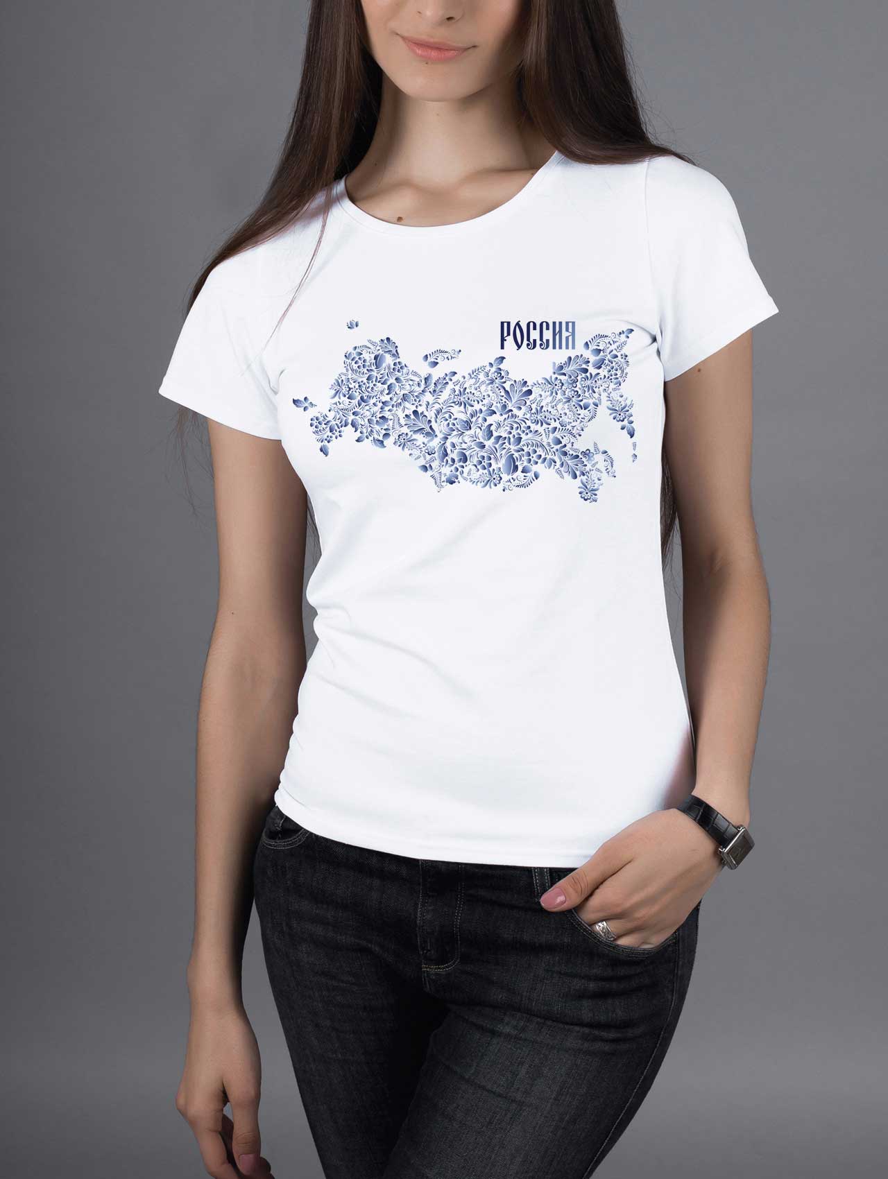 Футболка Карта России Гжель - Купить с доставкой по России в магазине Bullfinch. Приталенные футболки, Женская одежда. Гипоаллергенные краски. Премиальное качество. Размеры: L, XL, XXL