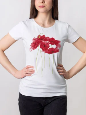 Футболка Красные маки - Купить с доставкой по России в магазине Bullfinch. Приталенные футболки, Женская одежда. Гипоаллергенные краски. Премиальное качество. Размеры: L, XL, XXL