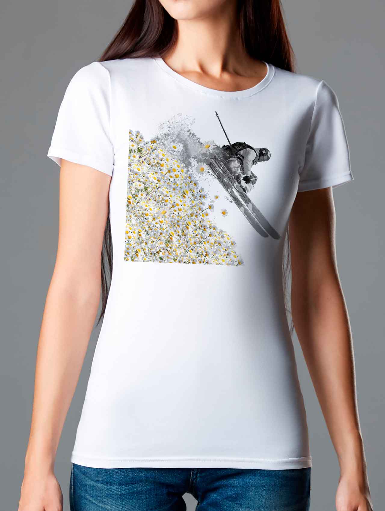 Футболка Лыжник на цветочной поляне - Купить с доставкой по России в магазине Bullfinch. Приталенные футболки, Женская одежда. Гипоаллергенные краски. Премиальное качество. Размеры: L, XL, XXL
