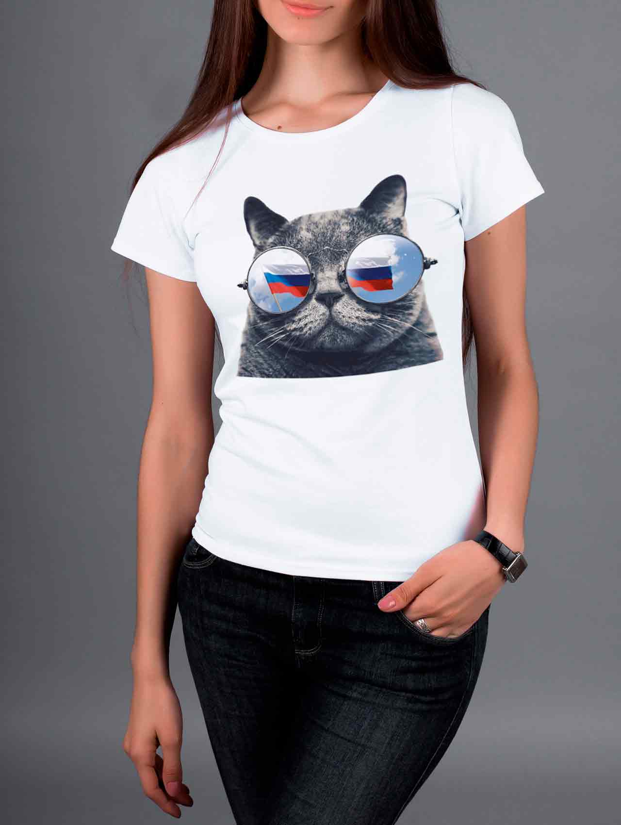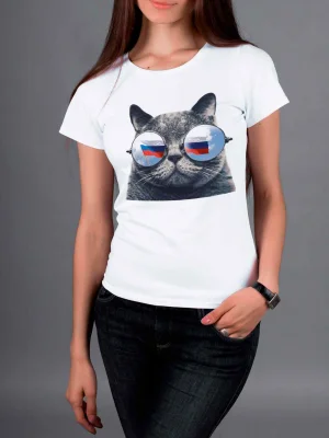 Футболка Серый Кот в Очках - Купить с доставкой по России в магазине Bullfinch. Приталенные футболки, Женская одежда. Гипоаллергенные краски. Премиальное качество. Размеры: L, XL, XXL