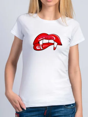 Футболка Вампирские губы - Купить с доставкой по России в магазине Bullfinch. Приталенные футболки, Женская одежда. Гипоаллергенные краски. Премиальное качество. Размеры: L, XL